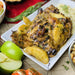 Grilled chicken thighs, apples and caramelized onions simmered in a rich savory cider with a hint of sweetness. Enjoy with a side of white rice (included with each portion).